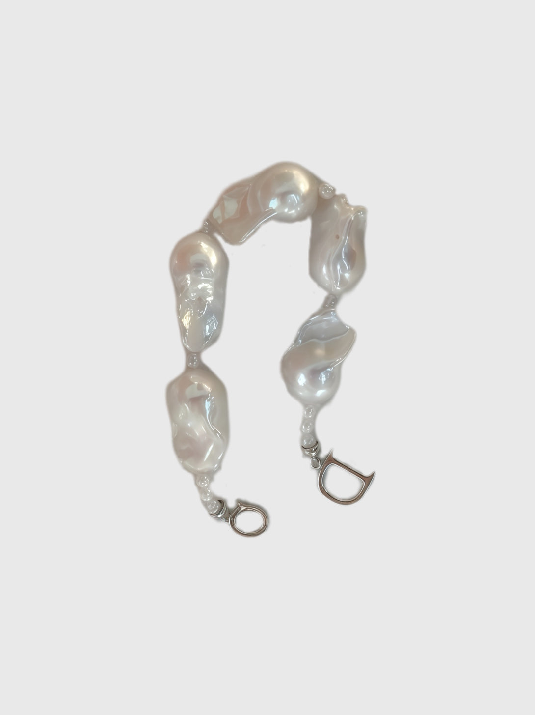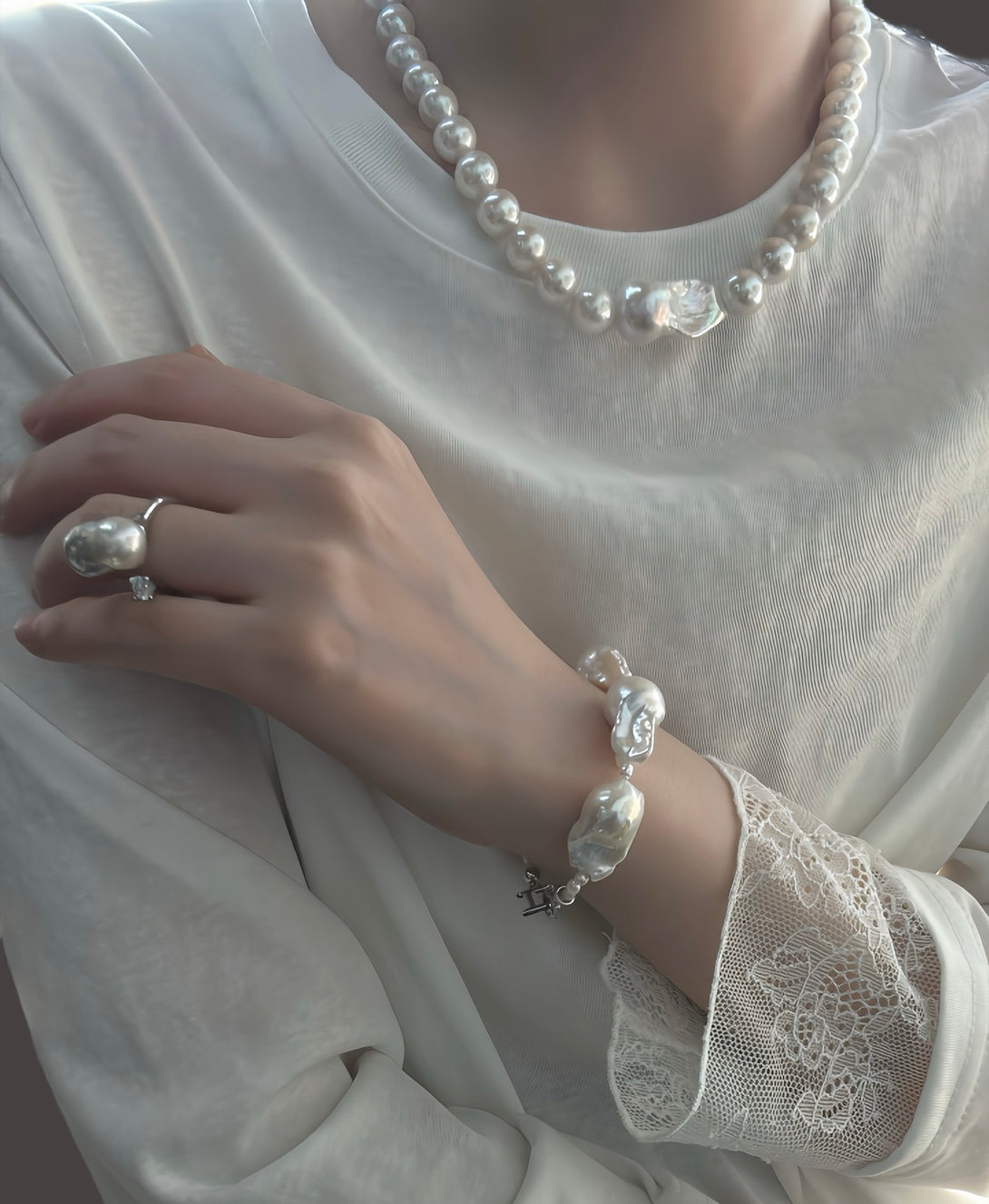 A composition of luminous baroque pearls, each one a sculpted fragment of ocean’s memory, strung together in quiet reverence. Their irregular forms shimmer with the mystery of moonlight on water, threaded with delicate seed pearls that whisper between them like seafoam on the tide. Anchored with polished silver clasps, this piece drapes the wrist in soft radiance, evoking the rhythm of the deep and the poetry of the shore.