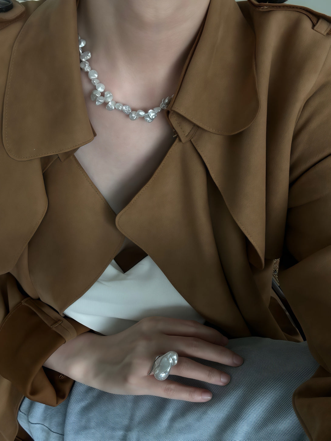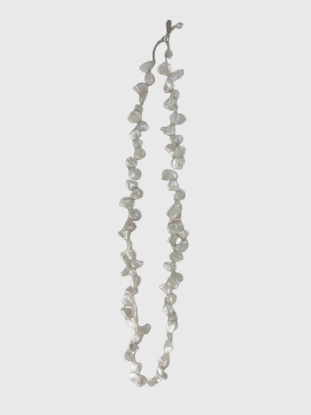 Fractured Light is a celebration of organic chaos, a cascade of irregular keshi pearls, each one shaped by chance and the shifting tides of nature. Their unruly forms catch the light in unexpected ways, scattering soft glints across their surfaces like reflections on water. Strung together, they speak not of symmetry but of movement, individuality, and quiet resilience. This is refinement without rigidity, a necklace for those who find elegance in the unplanned.