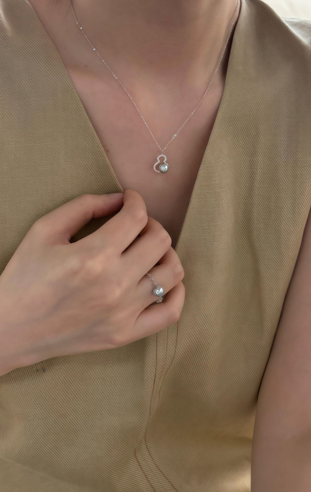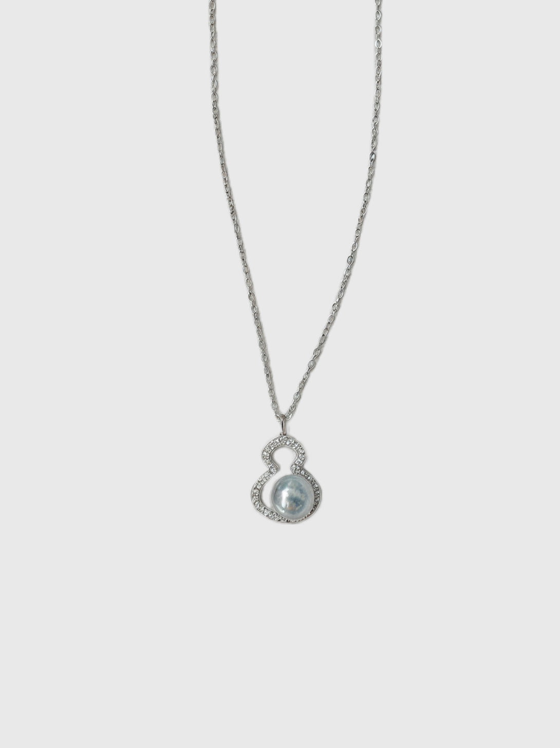 Iris captures the charm of the unexpected: a luminous pearl held within a double-gourd silhouette, edged in shimmering crystal. The pendant’s curves recall ancient symbols of abundance and protection, while the subtle asymmetry of the freshwater pearl brings an organic softness to the precise lines of its silver form. Suspended from a delicate, twisted chain, this piece sits lightly at the collarbone, refined, serene, and quietly powerful.