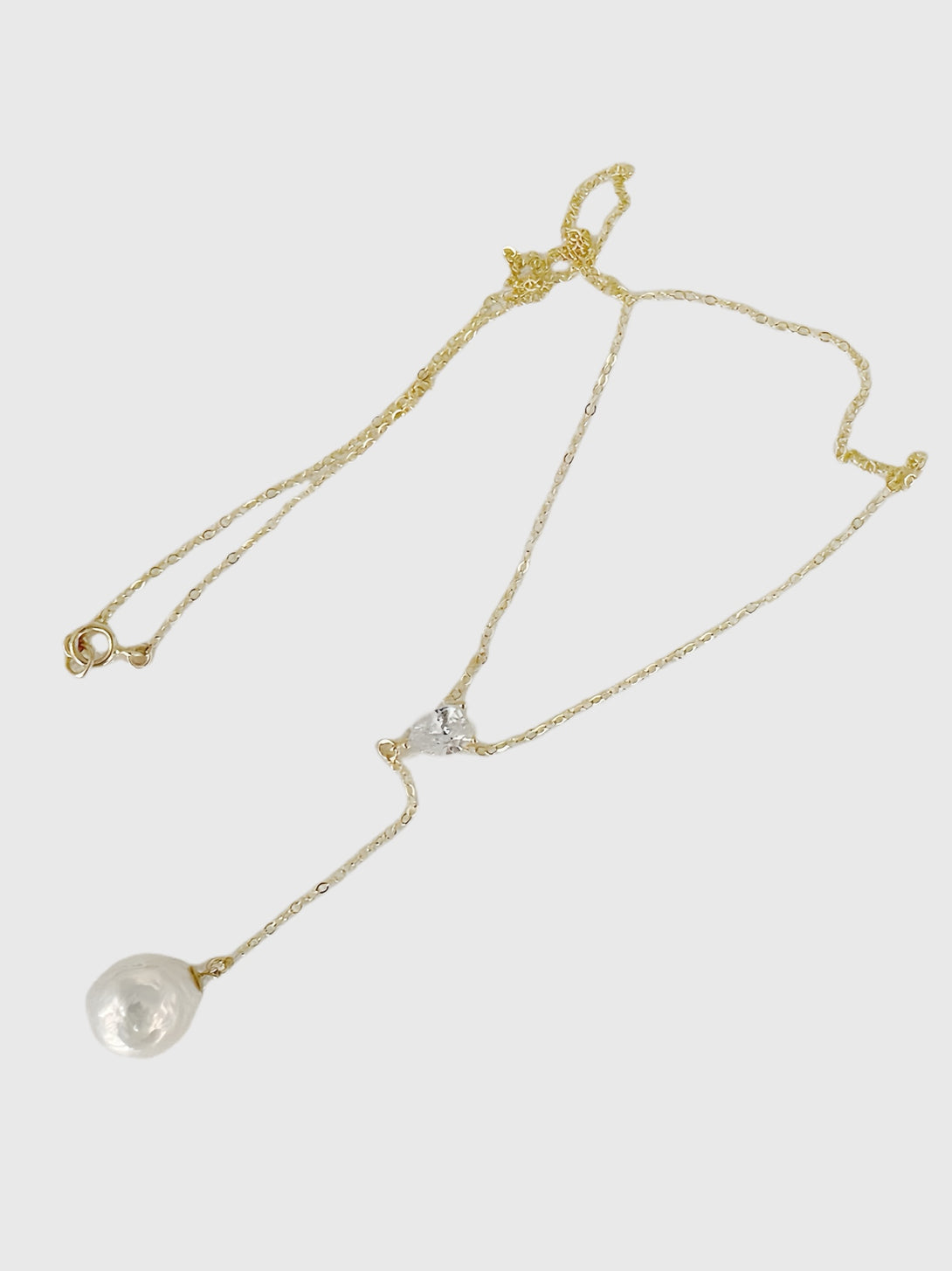 This captivating necklace features a luminous baroque pearl, each curve echoing the organic wonder of stardust frozen in time. Suspended from a delicate gold chain and accented by a brilliant marquise-cut crystal, Lyra Aurea captures the quiet grandeur of a star’s final note in the night sky. Inspired by the ancient lyre of myth and the radiant arcs of the cosmos, this piece is a harmony of light, motion, and timeless beauty, a tribute to those who carry the universe with grace.