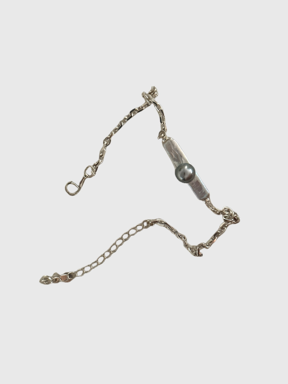Moonthread traces the sky’s softest hush in a single, deliberate line, an elegant silver chain framing a slender, iridescent bar, anchored by a solitary Tahitian pearl. The contrast of textures, the linear and the round, the cool and the luminous, recalls the moon trailing threads of light across a midnight tide. Ethereal, minimal, and poetic, Moonthread is a quiet statement of restraint and refinement.