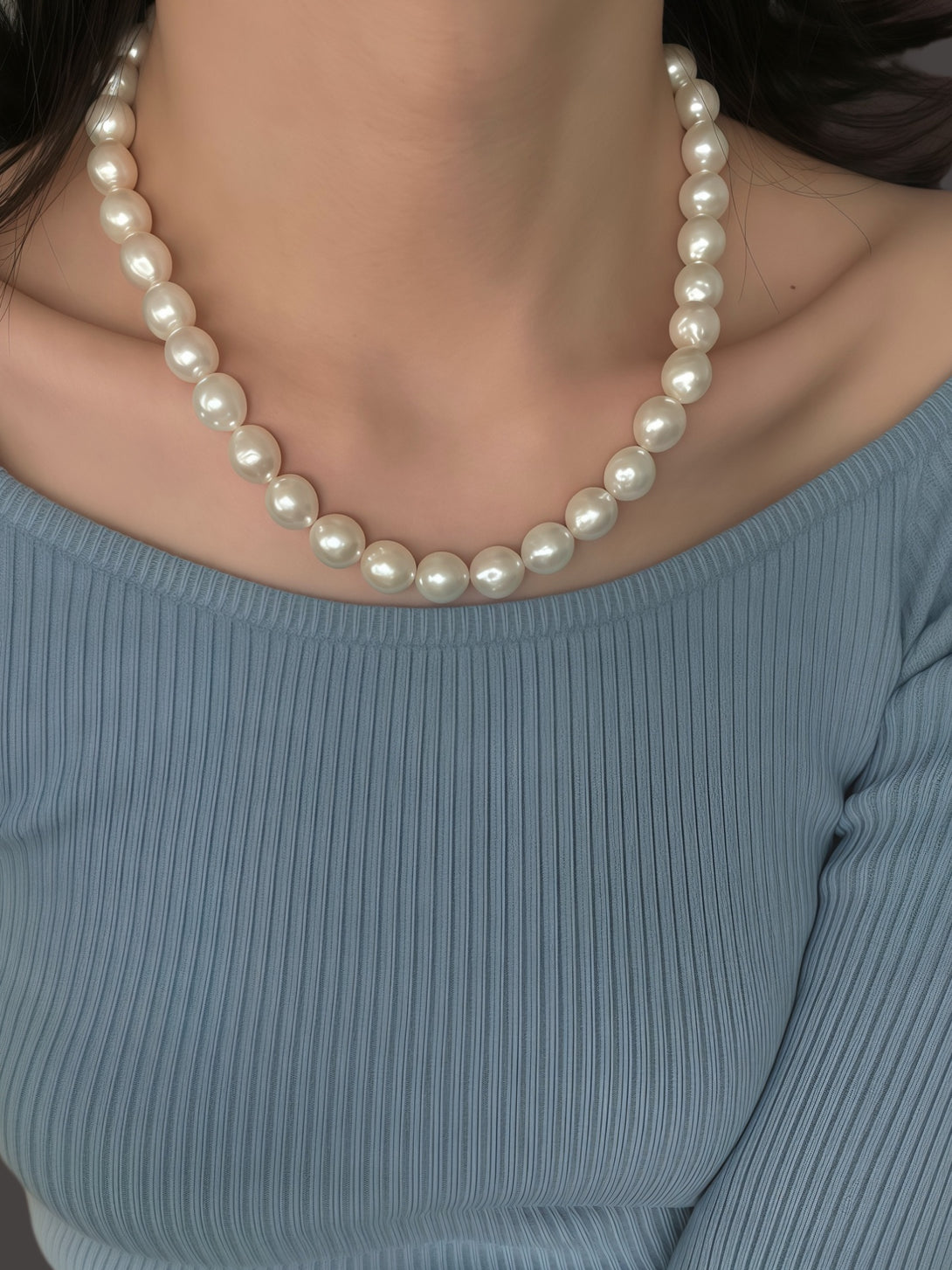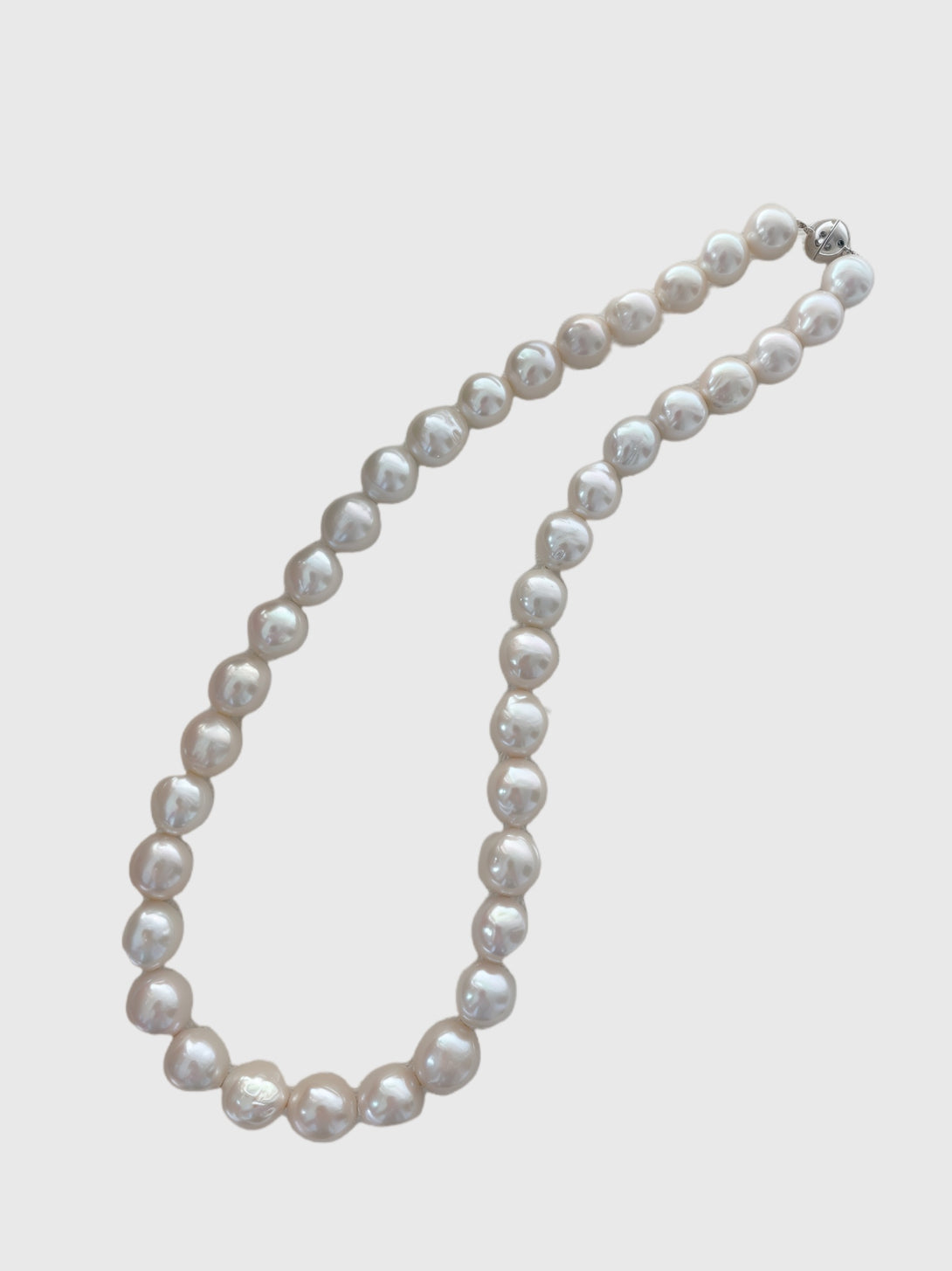 Composed of luminous Edison pearls individually strung to reflect the gentle rhythm of the cosmos, each pearl is distinct in shape, giving the necklace a soft organic flow that mirrors a constellation traced in moonlight. A minimalist silver clasp completes the piece, allowing the natural radiance of the pearls to take center stage. This necklace balances refinement and quiet strength, designed to orbit effortlessly between day and night.