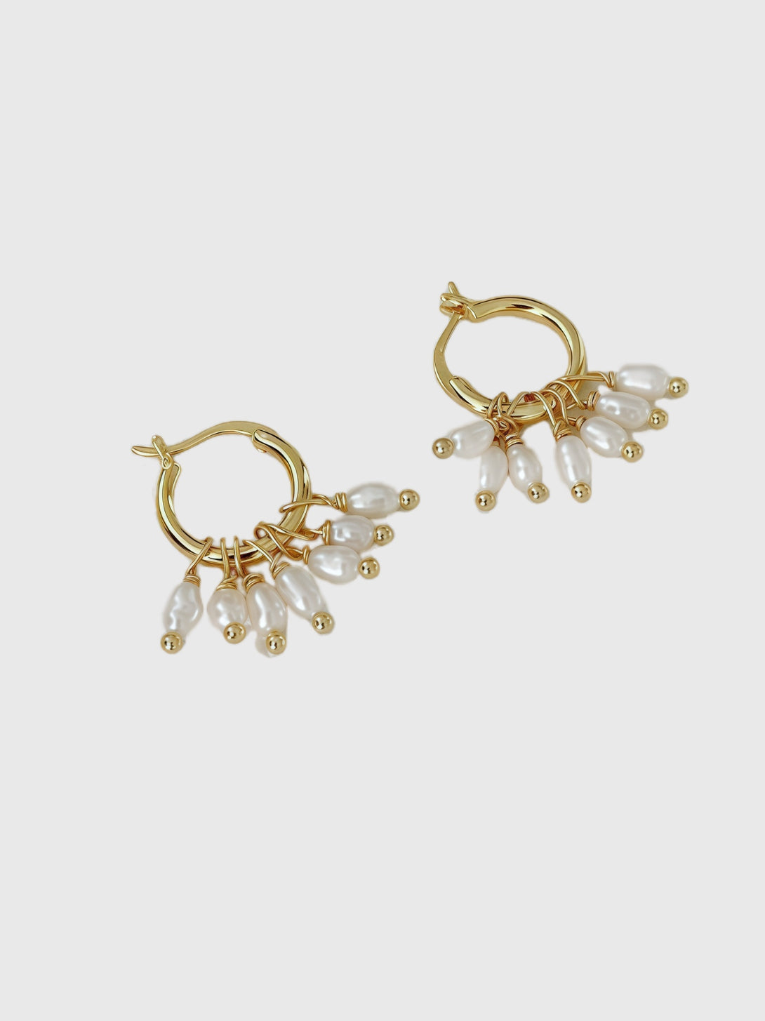 Petalburst earrings bloom with graceful energy, each delicate pearl drop like a dewdrop on a golden bud. Suspended from lustrous gold hoops, the clustered freshwater pearls shimmer with soft luster and motion, evoking the gentle unraveling of petals at first light. Joyful yet refined, these earrings bring a sense of rhythm and bloom to the everyday, carrying the quiet elegance of nature's most poetic moment, when a flower dares to open.