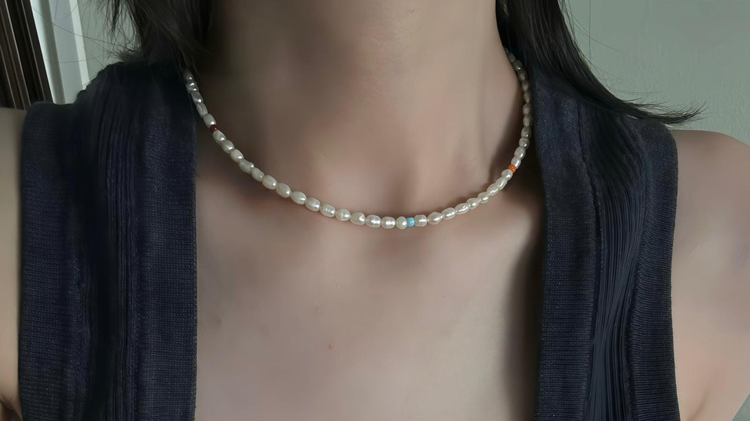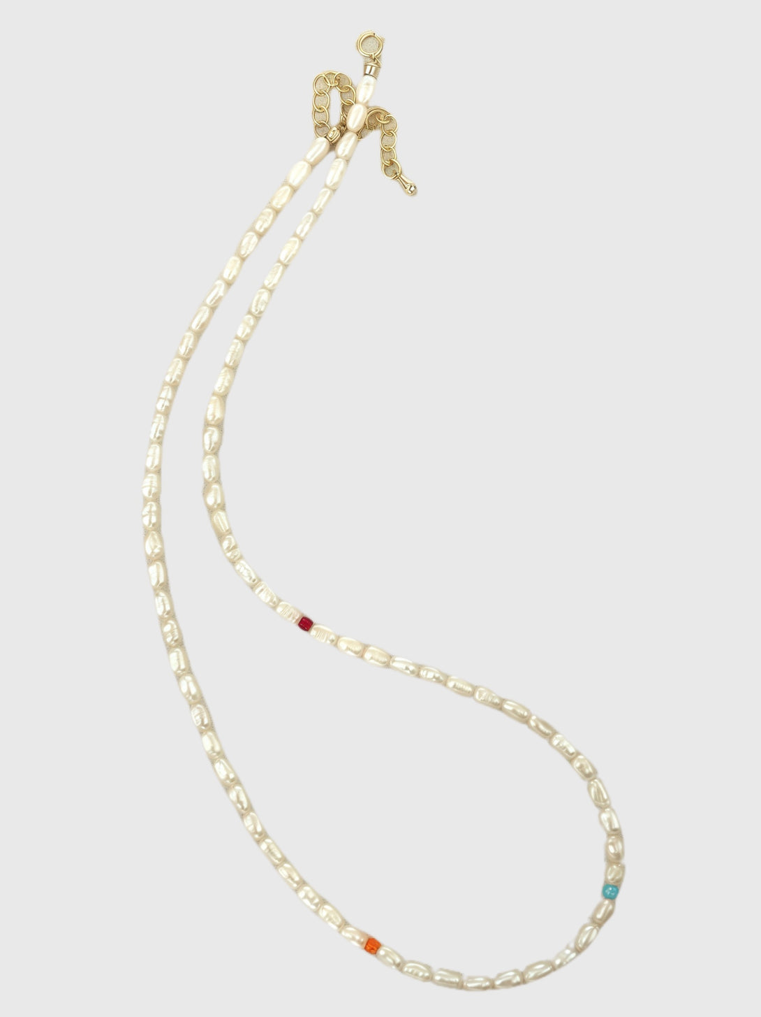 This necklace reinvents the classic with a whisper of whimsy. Irregular freshwater pearls bring a soft, organic texture, while the single pops of turquoise, amber, and ruby-toned glass beads add a spirited, contemporary edge.