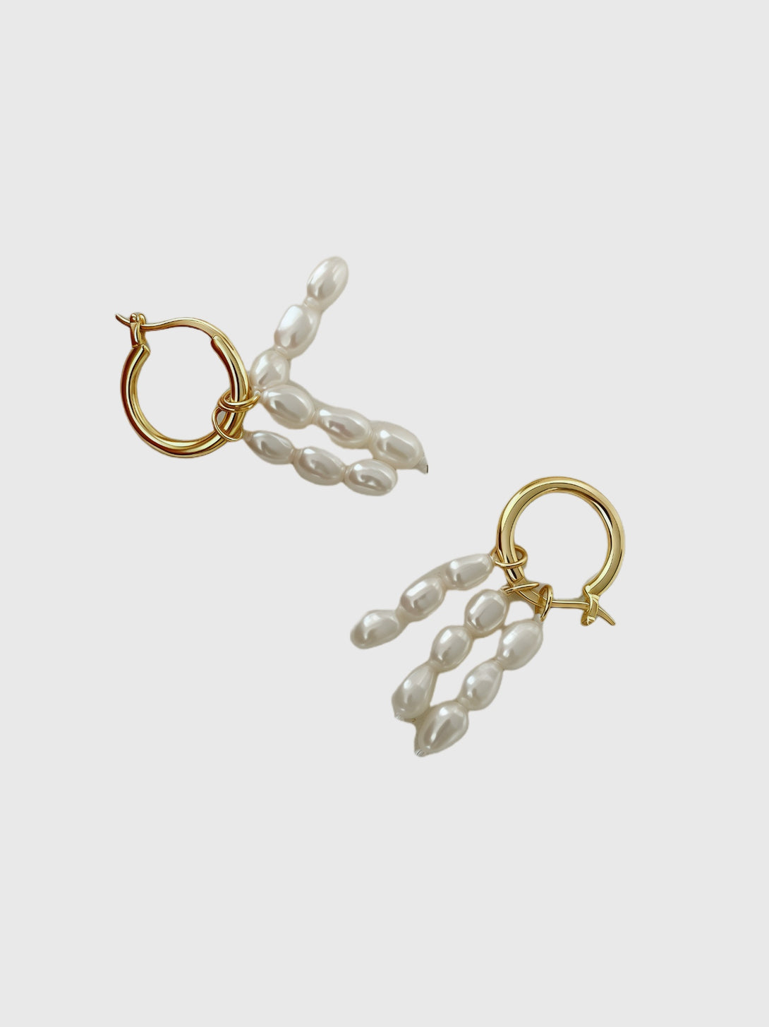 Ricefall is a playful ode to rhythm and asymmetry, where golden hoops cradle clusters of rice-shaped freshwater pearls that dance with every step. Suspended like gentle droplets caught mid-fall, each strand moves freely, reflecting light with quiet shimmer. The irregular beauty of the pearls brings an organic charm, while the polished gold hoops add modernity and warmth. Lightweight and full of energy, these earrings echo a delicate rainfall at sunrise, subtle yet striking, fluid yet refined.