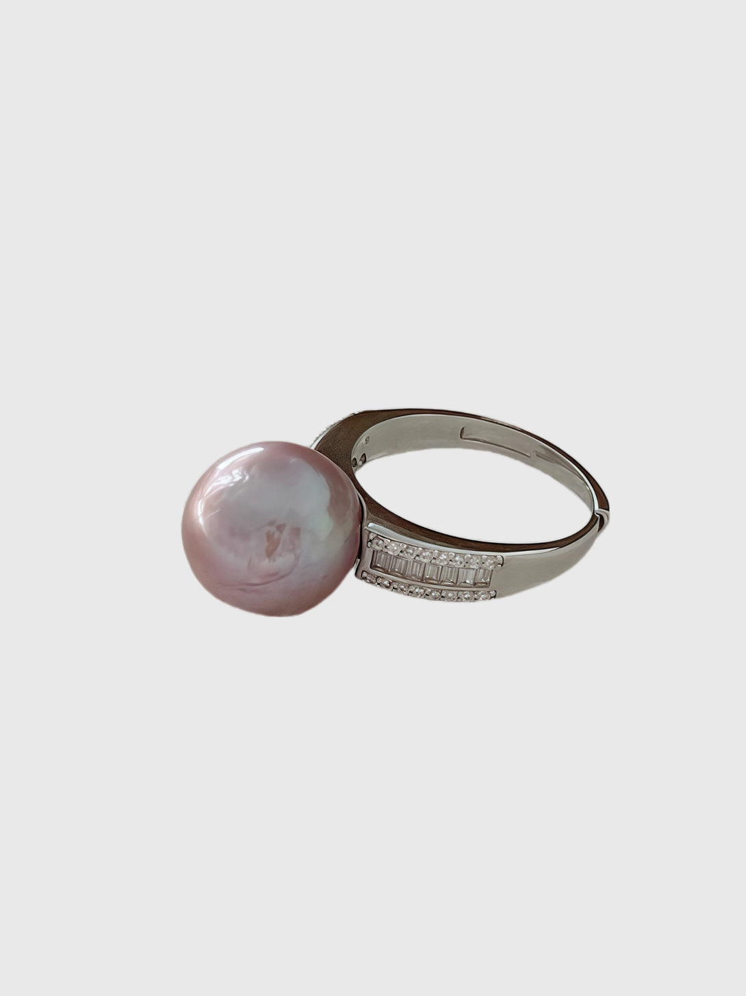 A single blush pearl glows like morning light, set delicately upon a polished band traced with rows of radiant crystal. Roselight draws its strength from softness, its gleam from quiet power. The pearl's rose-hued sheen echoes warmth and grace, while the faceted stones shimmer with composed brilliance. This is a ring that doesn’t shout but sings, softly, of elegance, devotion, and stillness held in bloom.
