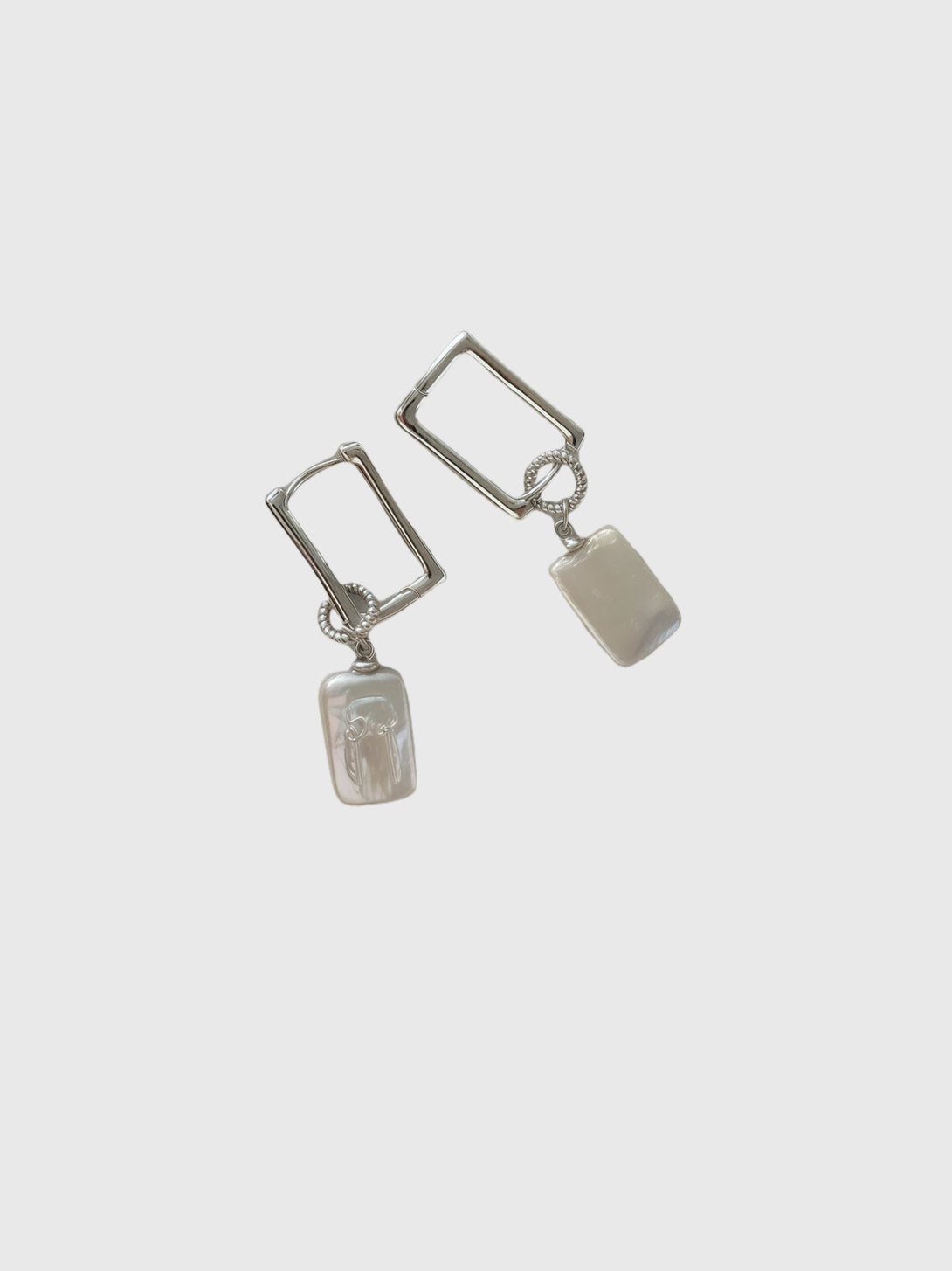 These earrings evoke the elegance of handwritten secrets and the architecture of modern grace. A rectangular pearl, smooth and luminous, dangles from a sterling silver frame, joined by a twisted ring that adds subtle texture and intrigue. One pearl bears a delicate engraving, like a whispered note left in moonlight. The geometric silhouette contrasts with the softness of nacre, balancing structure and shimmer in a composed and contemporary harmony. Silver Ledger is a quiet testament to clarity, mystery, and refined restraint.
