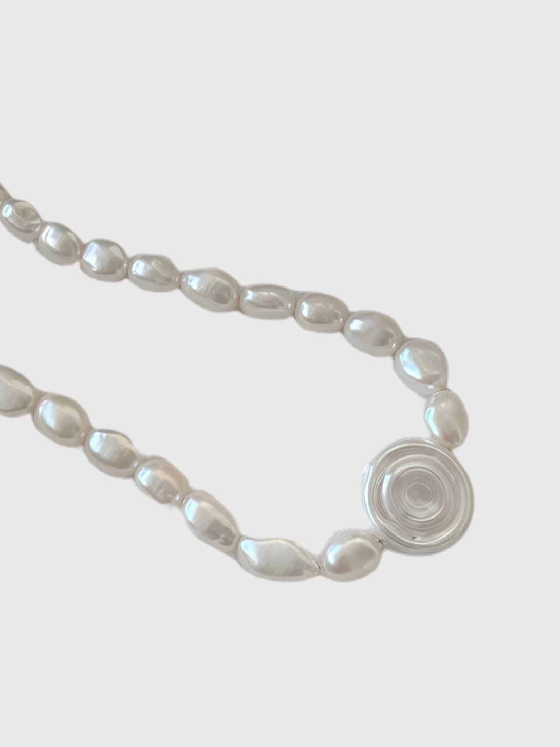 Each luminous freshwater pearl is carefully selected for its organic shape and soft sheen, creating a graceful rhythm along the strand. The subtle asymmetry of the pearls enhances the necklace’s sculptural quality, while the spiral centerpiece adds a contemporary focal point both poetic and architectural.