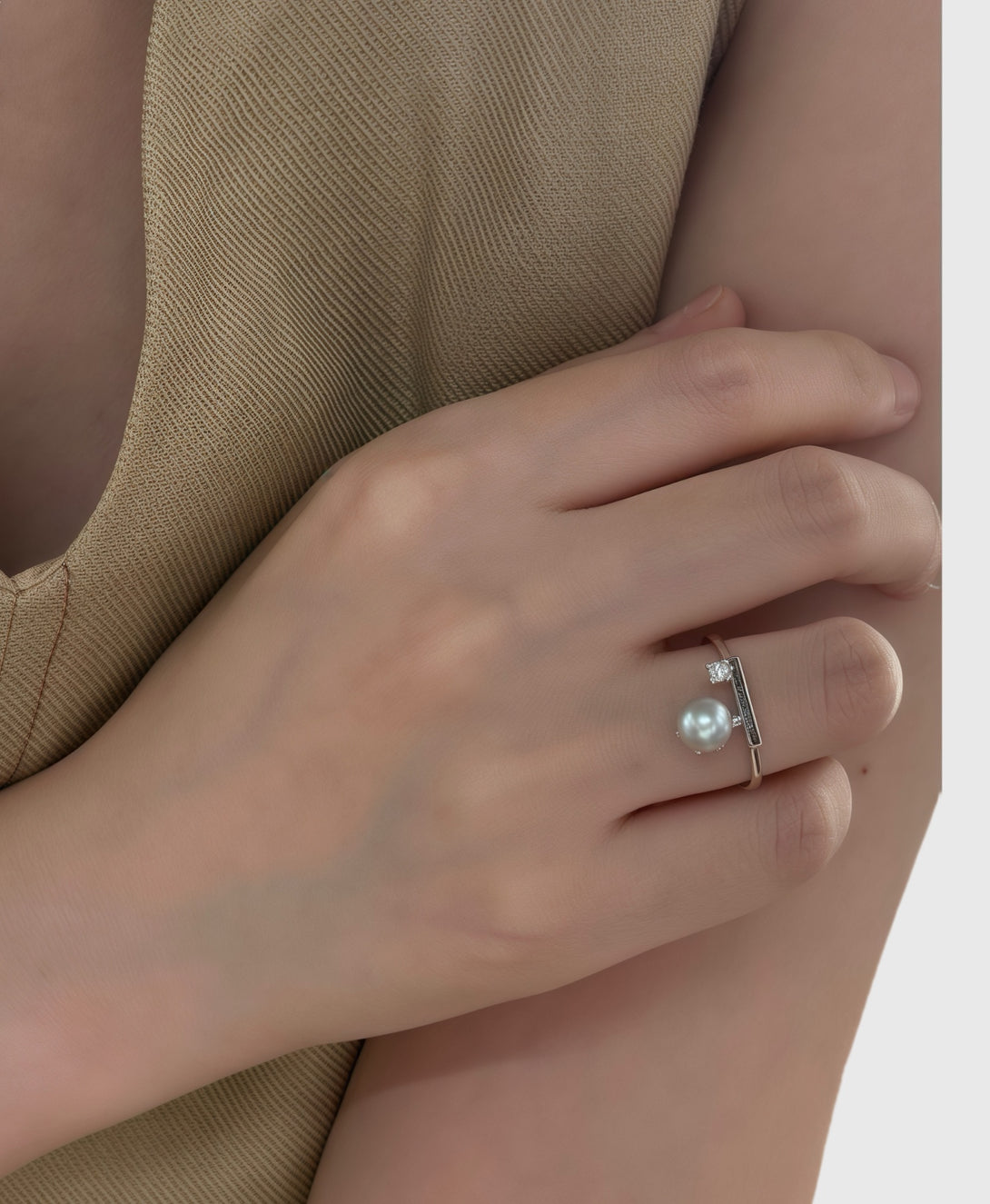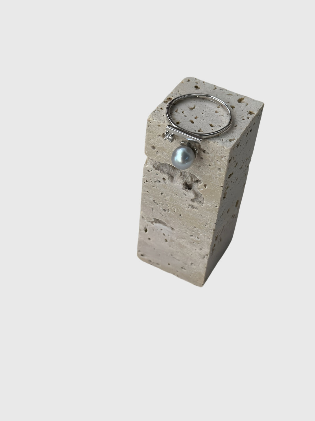 A ring of quiet mystery, Stone Whisper centers a gentle grey pearl in a polished silver setting, its subtle sheen evoking mist on ancient stone. Beside it, a single white diamond flickers like a forgotten memory, restrained yet radiant. This piece speaks in low tones, offering elegance not in volume but in presence, a modern relic for those drawn to the soft gravity of stillness.