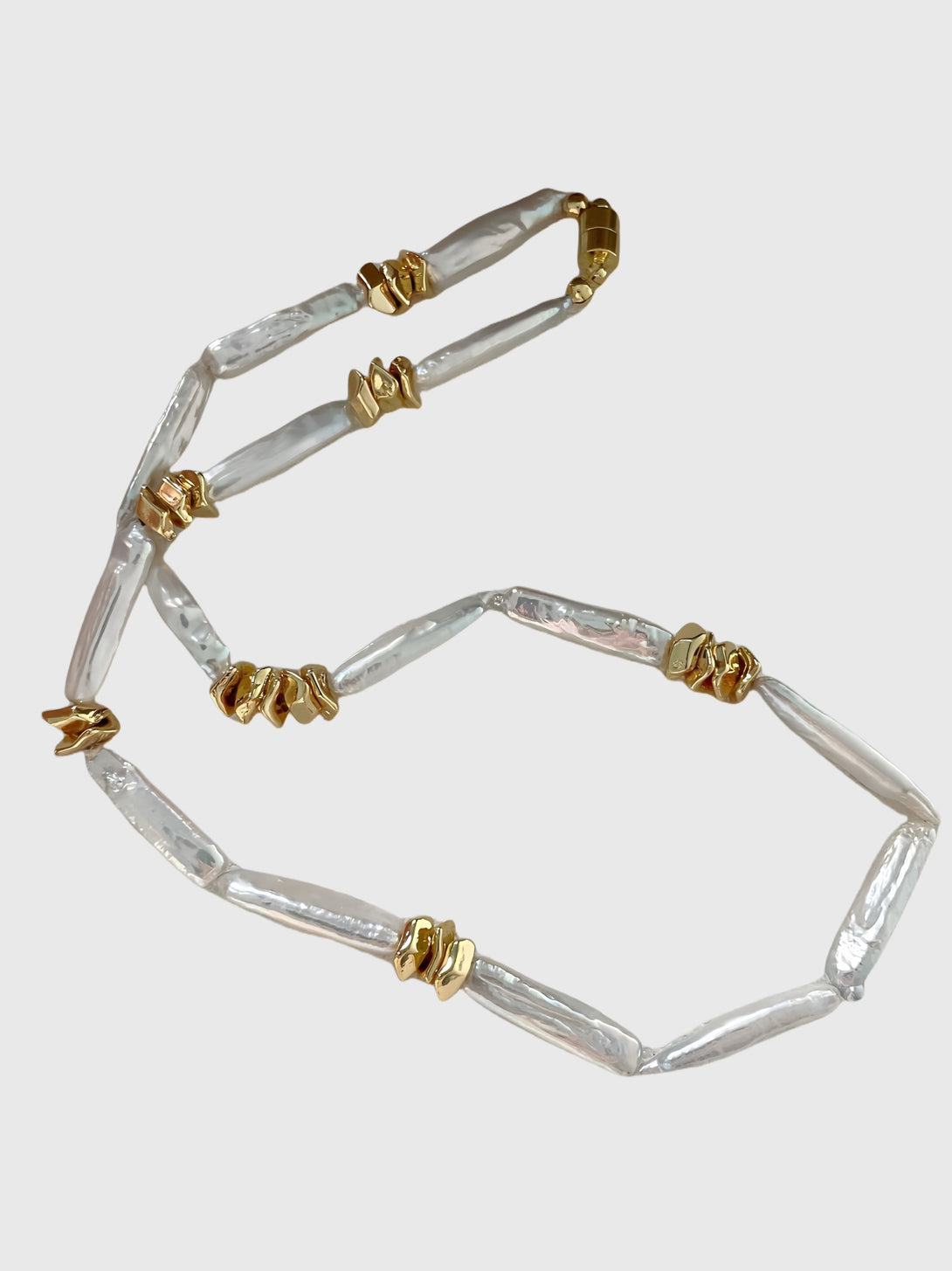 Introducing Tessera, a necklace built from elongated baroque pearls interrupted by molten-like gold shards. Each transition is deliberate, each segment a study in balance: softness meets edge, shimmer meets structure.
