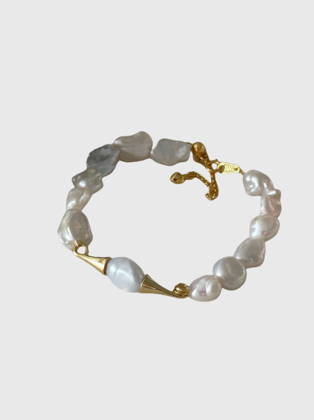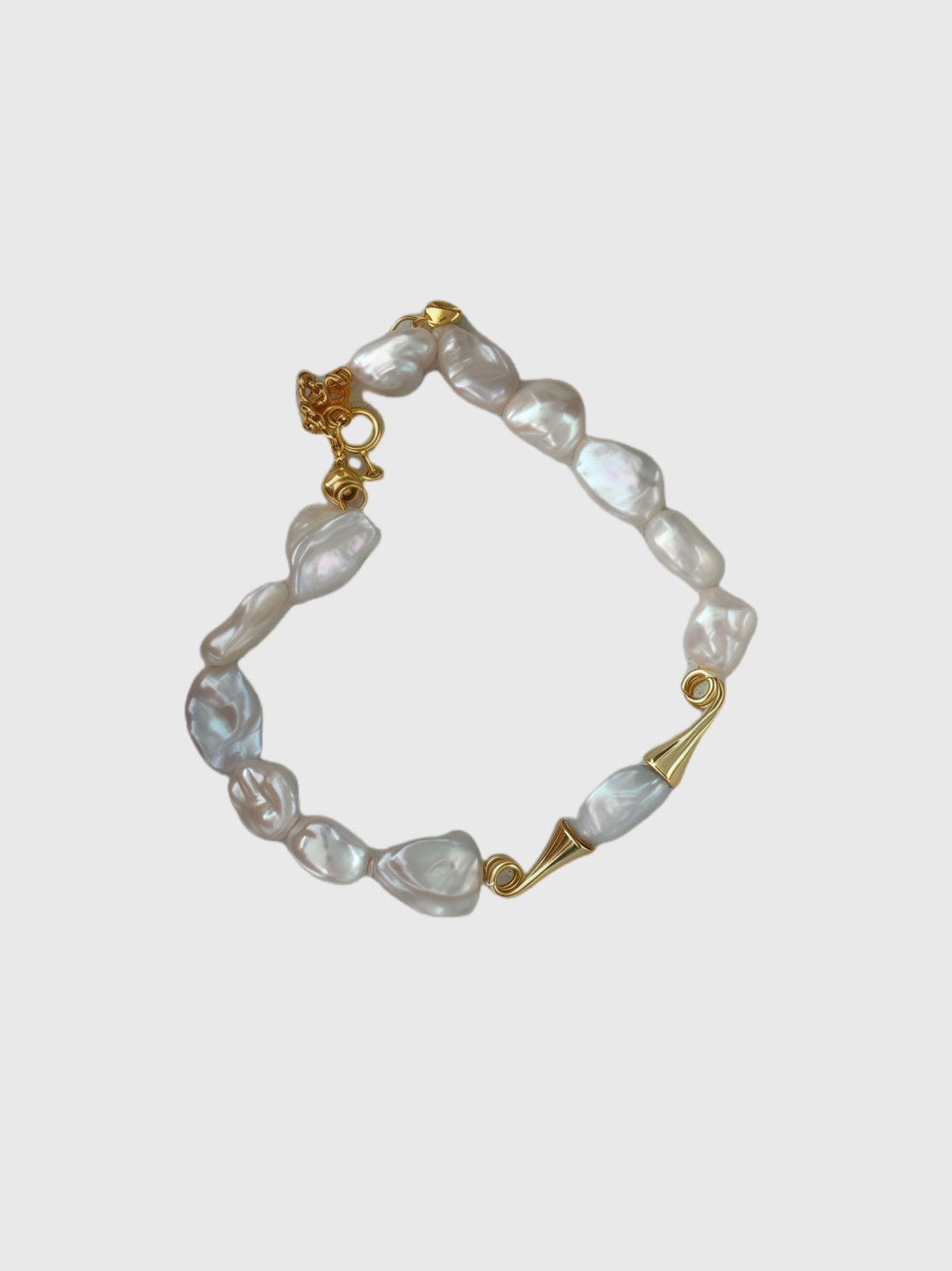 The Curled Verse is a lyrical composition in pearl and gold, each baroque pearl a note, each golden flourish a pause for breath. Asymmetry becomes rhythm here, with organic forms that glint with moonlight sheen, anchored by the unexpected twist of sculptural gold scrolls. A bracelet that doesn’t simply adorn, it recites.