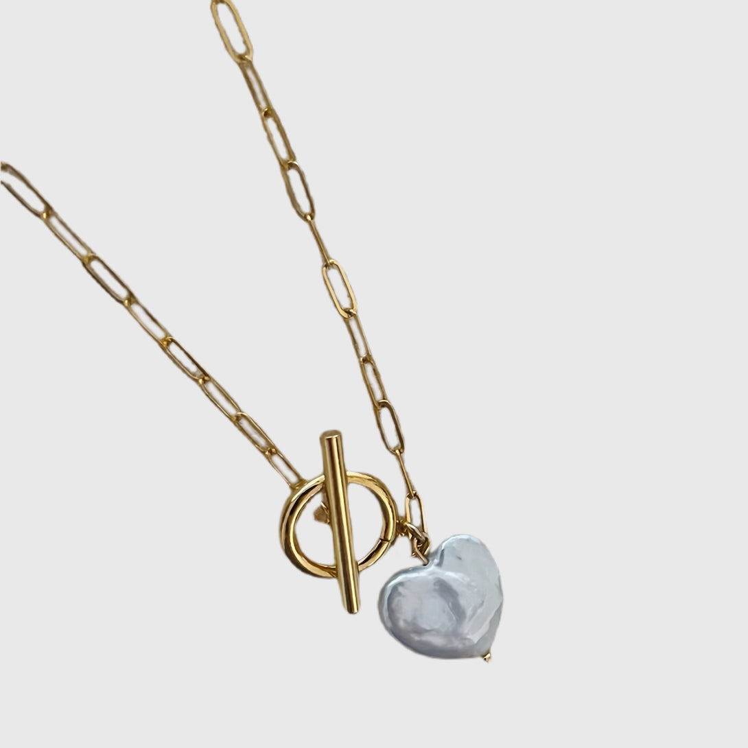 Unbalanced Love pairs a lustrous, irregular baroque pearl, shaped like a heart, yet unlike any other, with a bold gold paperclip chain and a sculptural toggle clasp. It's a modern heirloom for those who understand that real love, like this pendant, doesn’t follow a mold.