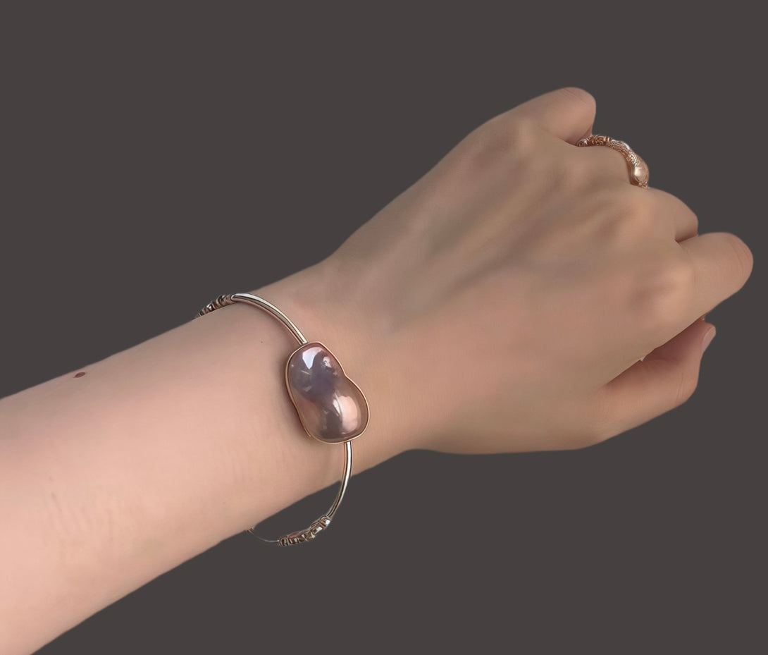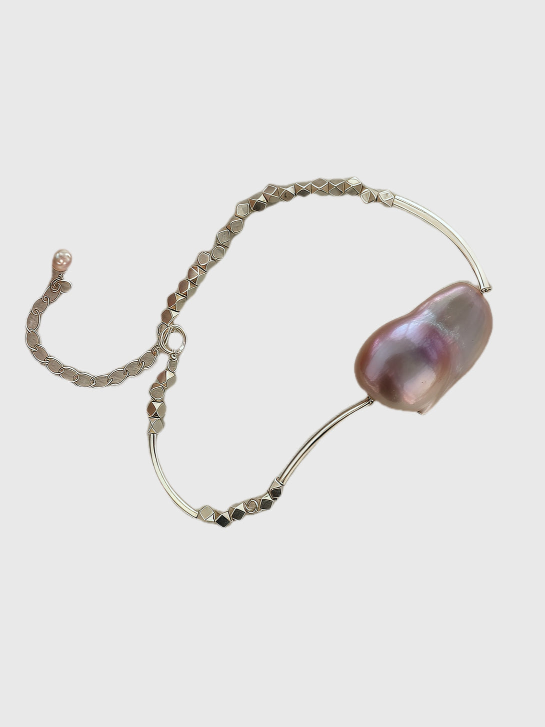 A lone, iridescent pearl radiates quiet defiance, its mauve and silver tones catching light like a whispered secret. Velvet Dissonance balances softness and edge, pairing asymmetry with sleek, geometric curves. It is a composition of contrasts, raw and refined, tender and bold, made to echo the silent strength of the wearer.