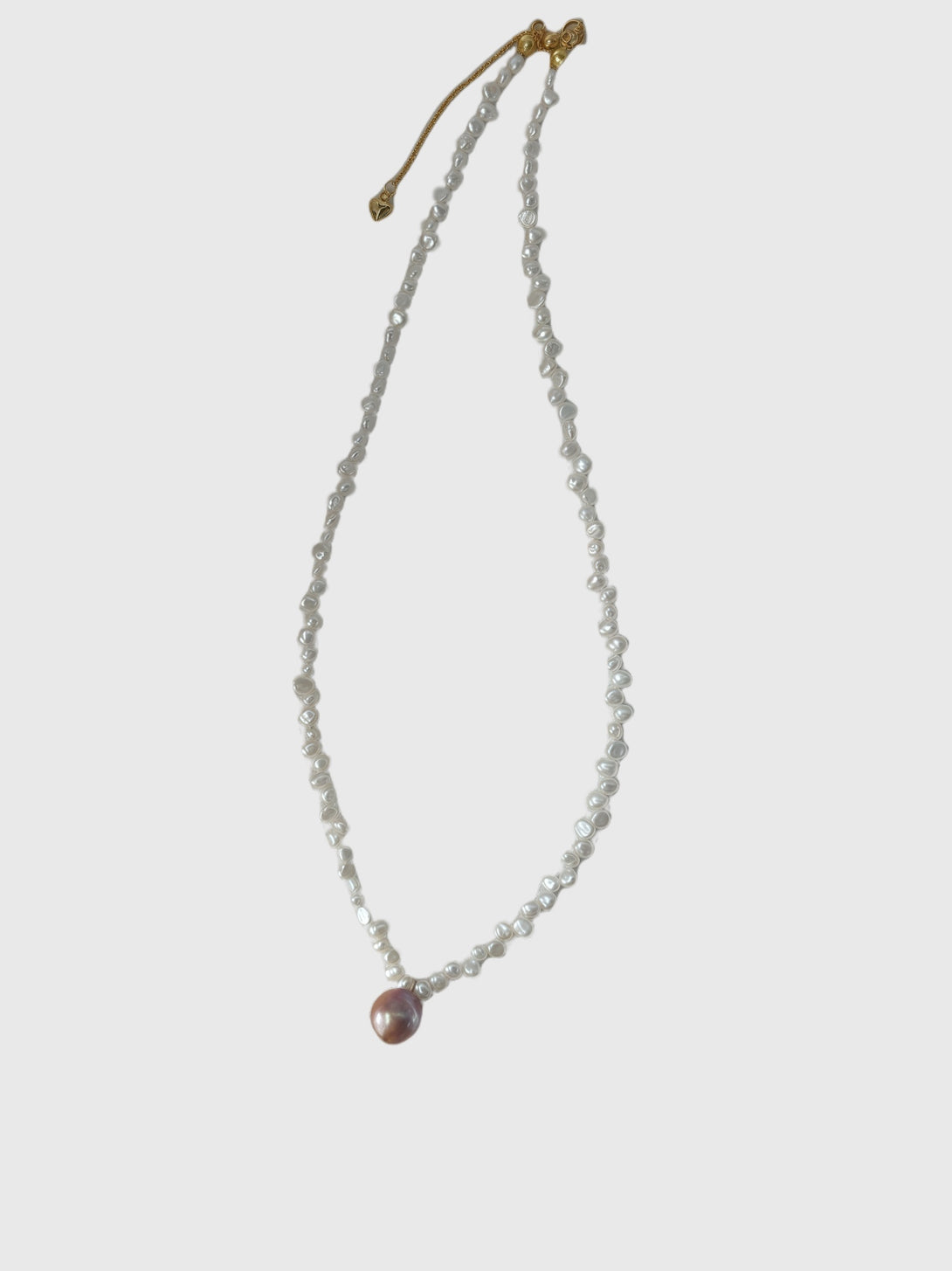Crafted from delicate, irregular pearls reminiscent of seafoam lace, Vento Rosa is a romantic ode to nature’s quiet drama. At its center, a single mauve baroque pearl hangs like a drop of dusk-tinted wind, unexpected, organic, and quietly captivating.