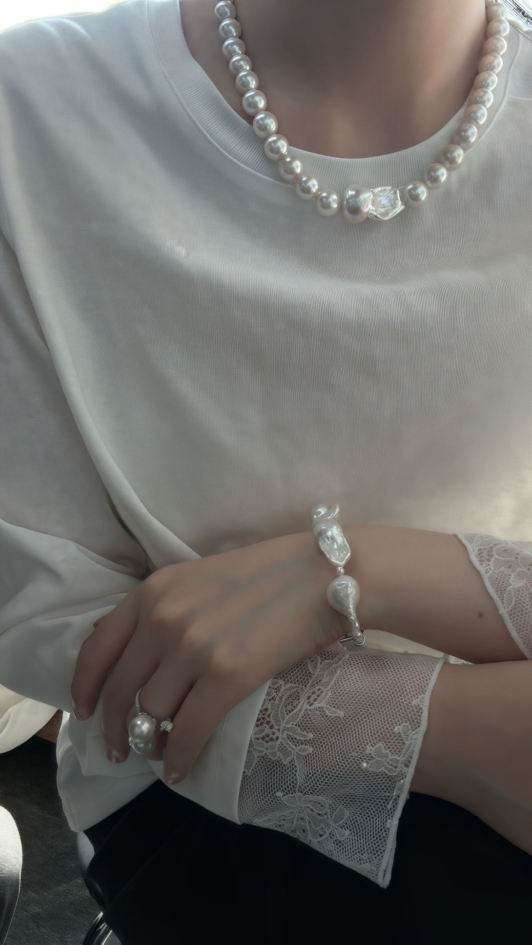 White Eclipse draws its strength from contrast: order and anomaly, symmetry and rupture. A strand of radiant pearls flows in pristine rhythm, only to converge on a singular baroque form, raw, untamed, and unapologetically present. It is this interruption that gives the piece its gravity, like the hush that falls before an eclipse. Both elegant and elemental, White Eclipse speaks to those who carry refinement with a touch of the unexpected.